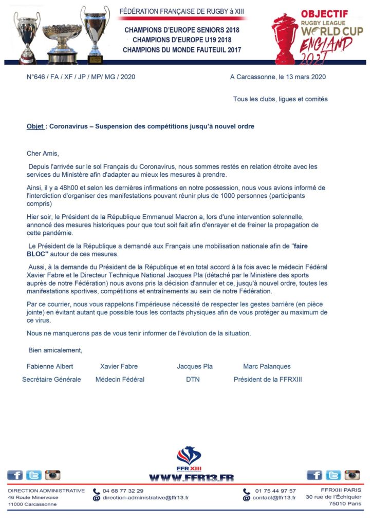 Communiqué Coronavirus – Suspension des compétitions jusqu’à nouvel ordre