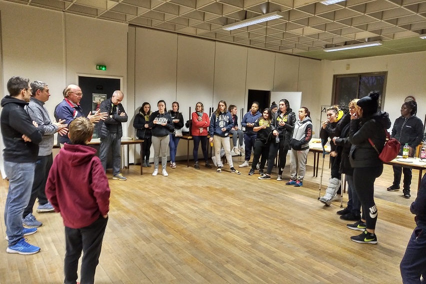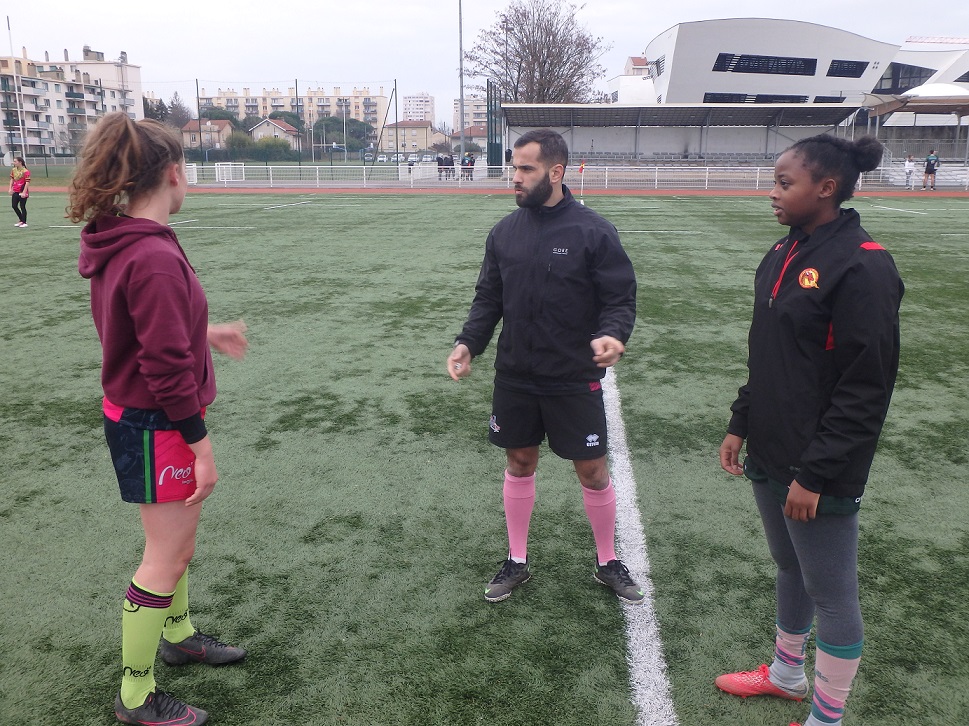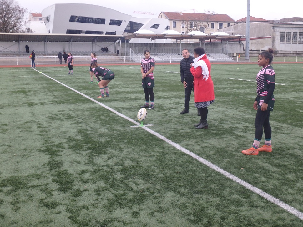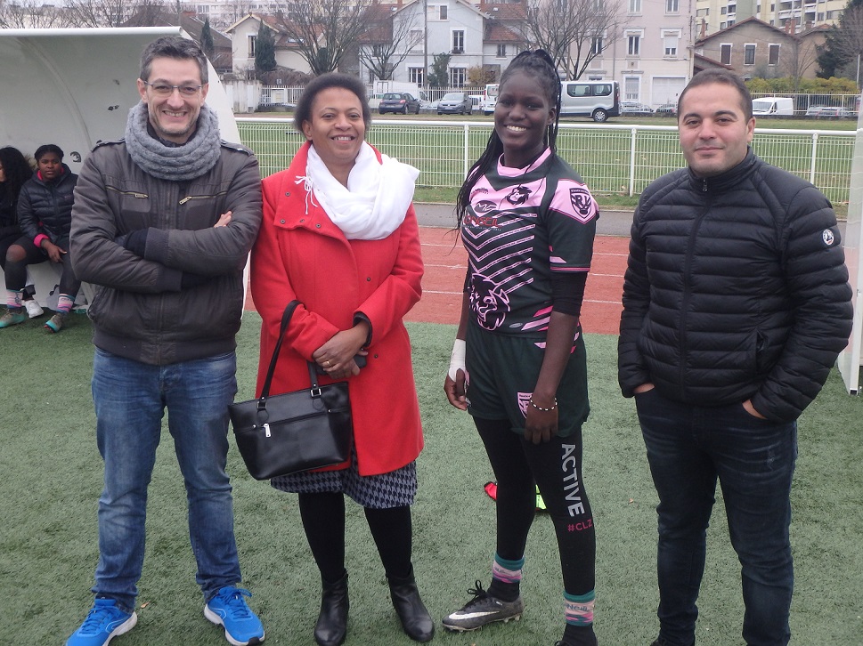 HOMMAGE A LA FORMATION: Lors de la réception d’après match, et après ce large succès des LIONNES de LVR/VVRL, en présence des dirigeants de Pia, de Pascal Merlin Co Président de la ligue AURA, de Stéphane Thirion, Président de VVRL, et de Denis Régnier Enseignant EPS au Collège Barbusse, des joueuses et dirigeants des deux équipes le Président du Comité du Rhône de rugby à XIII Jacques Cavezzan a tenu a féliciter les deux équipes pour la qualité du jeu ouvert produit aujourd’hui et a rendu Hommage à la formation et à la politique de développement de la pratique Féminine avec les collèges et les lycées depuis près de Dix ans dans le Rhône et en particulier avec le Collège Barbusse de Vaulx en Velin et le lycée Doisneau de Vaulx en Velin. “Plus de la moitié de l’effectif des Lionnes a débuté la pratique du Rugby à XIII au Collège de Barbusse” avec comme enseignant M. Denis Régier qui a reconnu ” je suis particulièrement surpris de voir les progrès accomplis par les filles de Barbusse par rapport à leur niveau au collège…et aussi content de voir le plaisir qu’elles manifestent sur le terrain à jouer ensemble !”. En conclusion le Président du Comité a tenu à féliciter les Trois Lionnes Elsa Bedu, Meissa Bouguessa et Marie Clemence Guillet pour leur première cape en Equipe de France obtenue en Octobre et Novembre et leur a remis un trophée en souvenir.